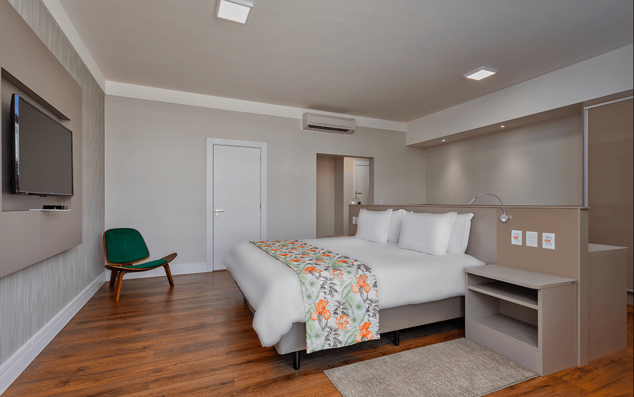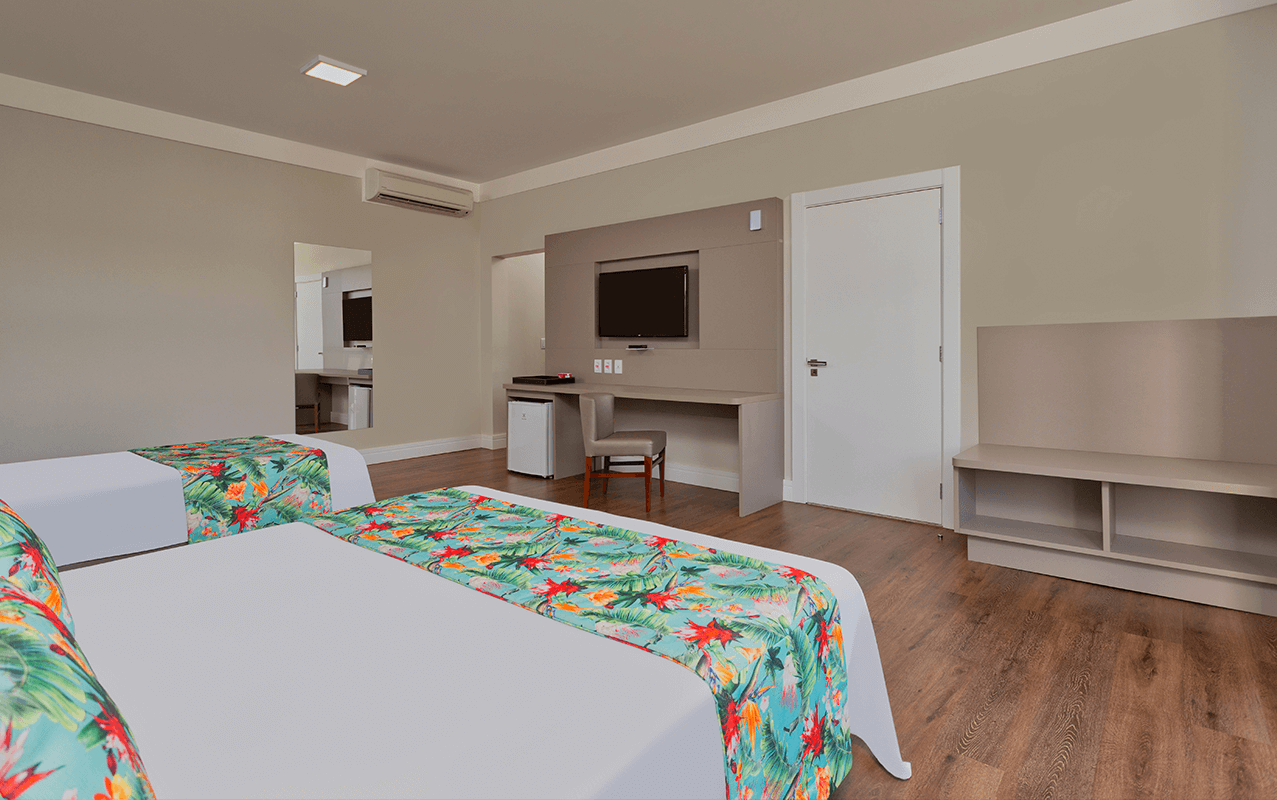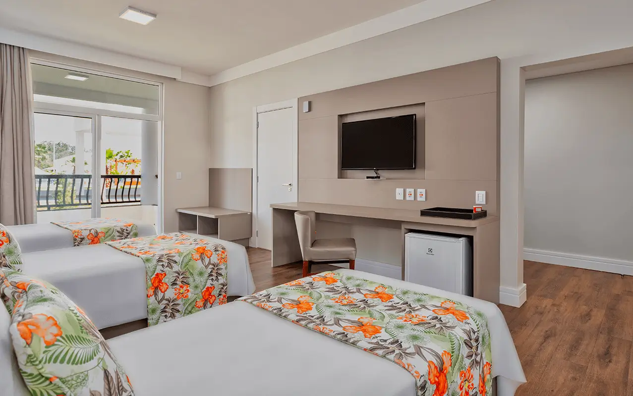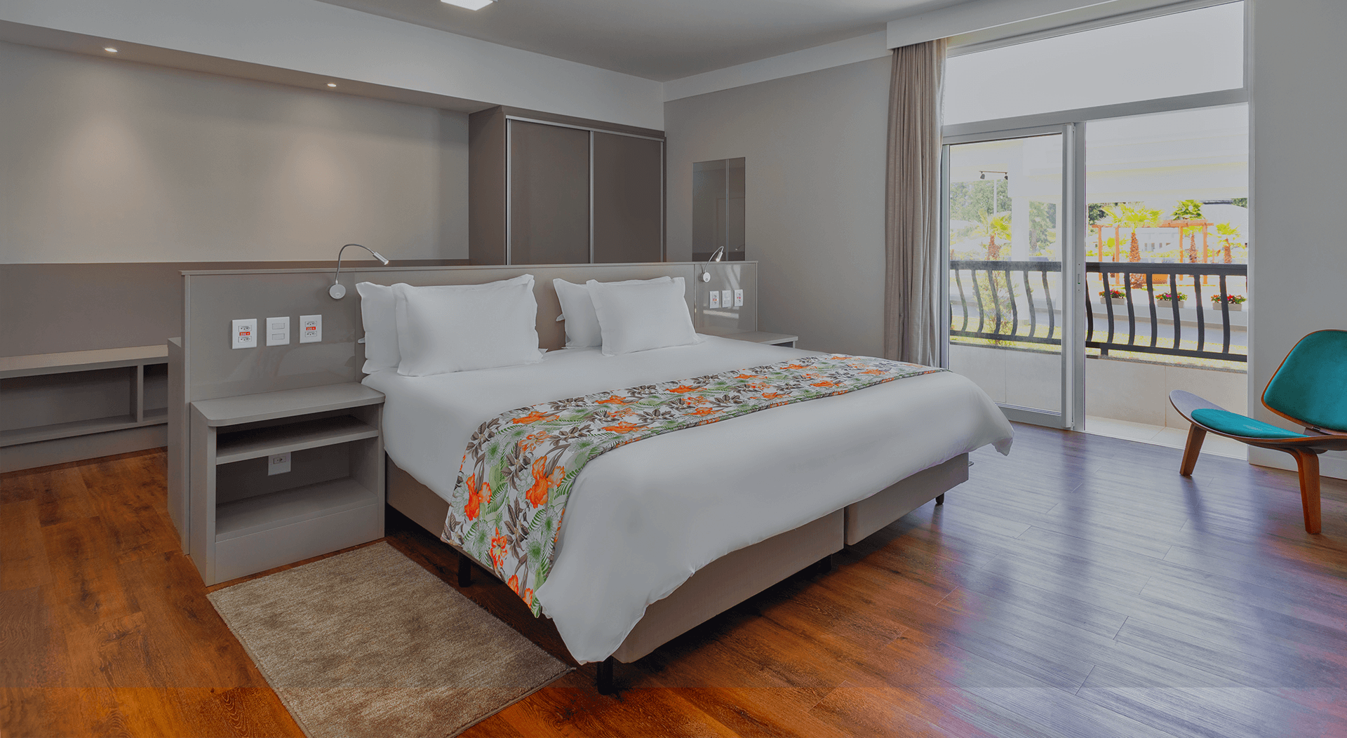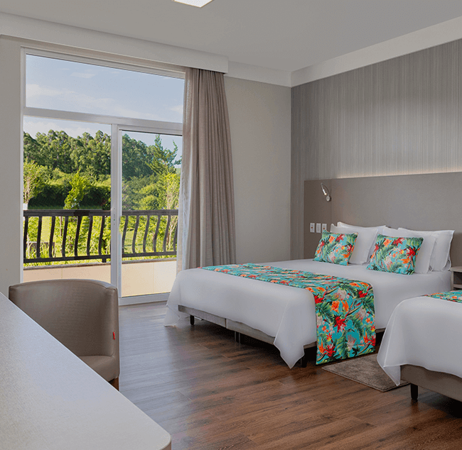 Os quartos são amplos, variando entre 36m² e 43m², equipados com ar-condicionado, smart TV, frigobar e varanda com vista para a natureza. O ambiente perfeito para descansar com conforto e exclusividade.