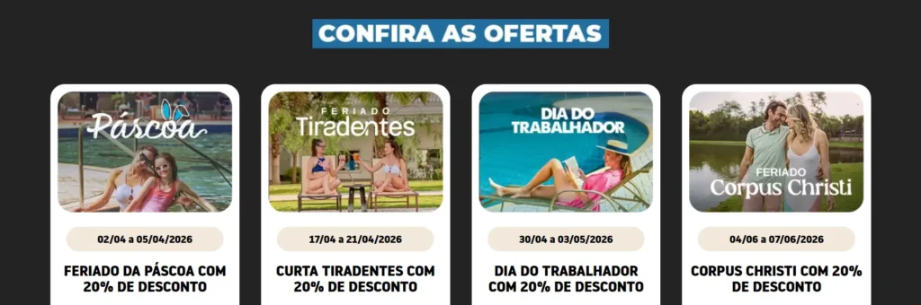 Feriados com até 20% de desconto no Lagos de Jurema: Tiradentes, Dia do Trabalhador e Corpus Christi! É a sua chance de aproveitar um dos melhores destinos termais do sul do Brasil com condições exclusivas!