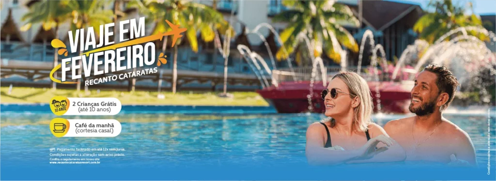 Viaje em Fevereiro para o Recanto Cataratas! Curta águas termais, pensão completa, 02 crianças cortesia até 10 anos e lazer total com bloquinhos e música ao vivo. Pagamento facilitado em até 12x sem juros no cartão.